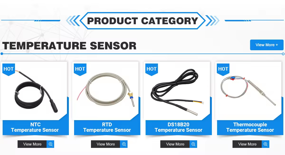 ผลิตภัณฑ์หลัก:เซ็นเซอร์อุณหภูมิและความชื้น, เซ็นเซอร์อุณหภูมิ DS18B20, เซ็นเซอร์อุณหภูมิ NTC, เซ็นเซอร์อุณหภูมิ RTD, เซ็นเซอร์อุณหภูมิ thermocouple